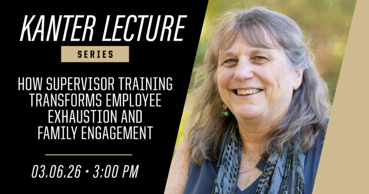 - Kanter Lecture: How Supervisor Training Transforms Employee Exhaustion and Family EngagementLearn how small changes in leadership and workplace culture can make a big difference in well-being, performance, and family engagement at this year’s Kanter Lecture, March 6 at 3 p.m. Kanter Award Finalist, Ellen Ernst Kossek will highlight how training supervisors to be more supportive can help employees feel less burned out and more engaged.